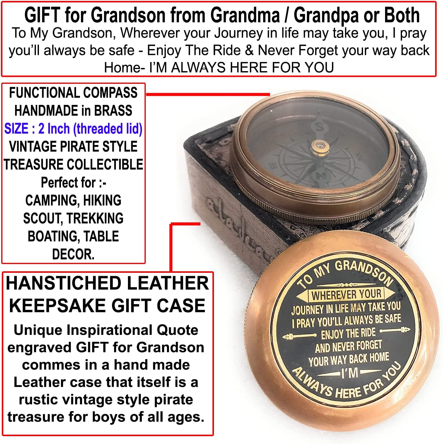 • Gift for Grandson from grandpa Grandma - Engraved Antique Style Brass Compass - Reinforcing & Reminder of Love & confidence for Grandson's Gift idea for boys on Birthday, Baptism, Confirmation, Graduation gift for Him, Boy from grand mother & grand father