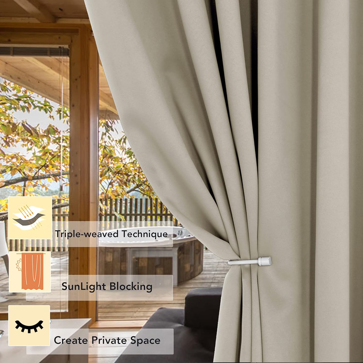 • PREMIUM BLACKOUT MATERIAL: Our room darkening curtain is made of 100% polyester fabric and have the same color with the front and back. Crafted in a certified STANDARD 100 by OEKO‑TEX factory from a durable soft and thick triple weave blackout fabric which block out 90% above sunlight and UV rays. Darker colors work better.