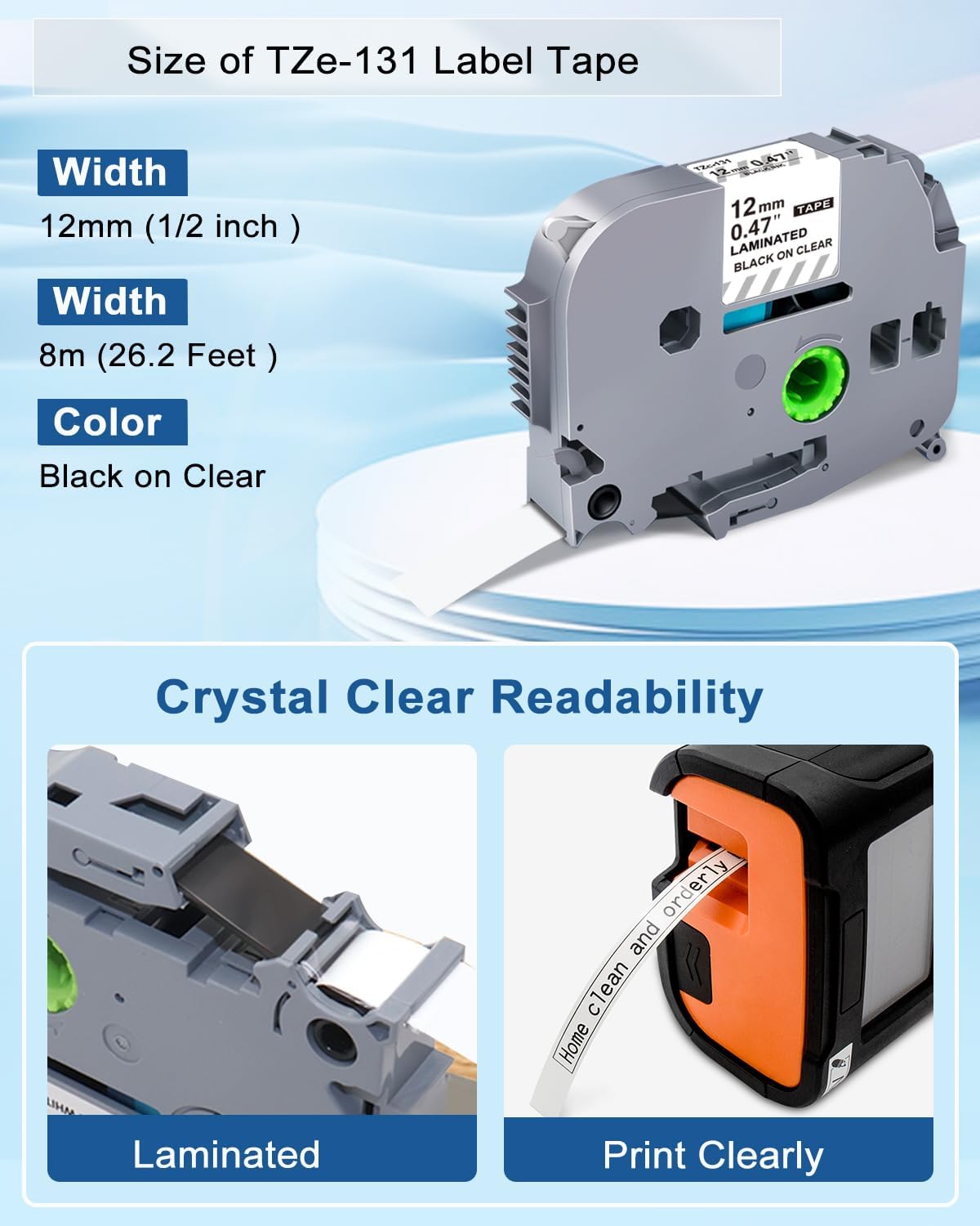 • 5-Pack Compatible with Brother label maker tape clear, Replacement for Brother TZe-131 TZe131 TZ131 TZ-131 TZe clear label Tapes; Size: 12mm (1/2'') x 8m (26.2') per clear label maker tape; Color: Black on Clear