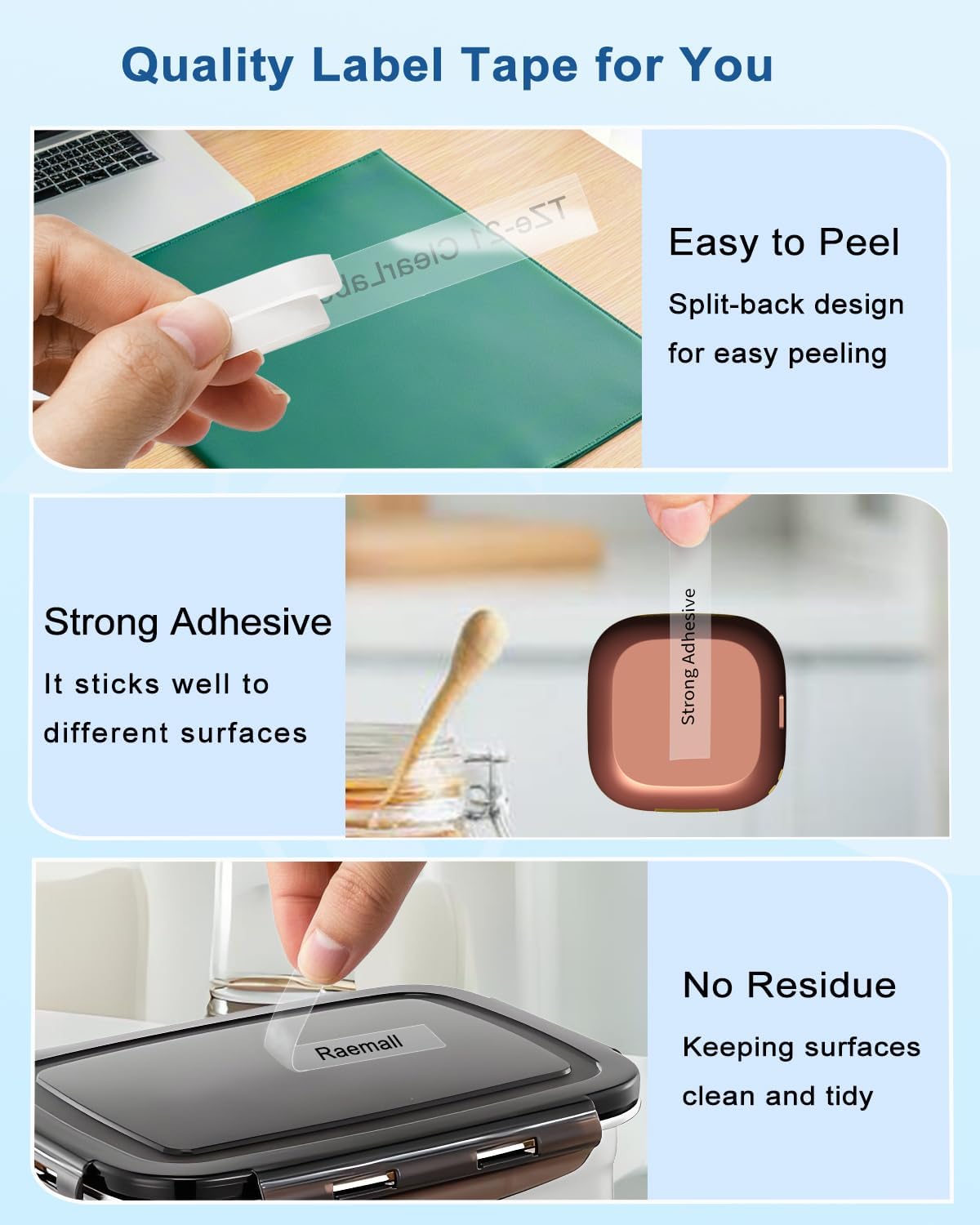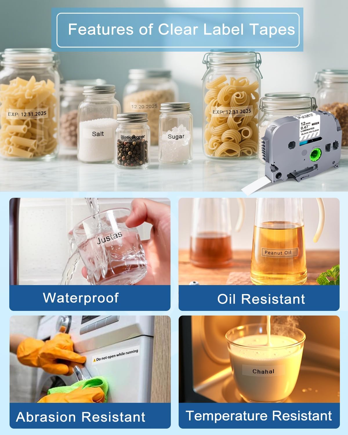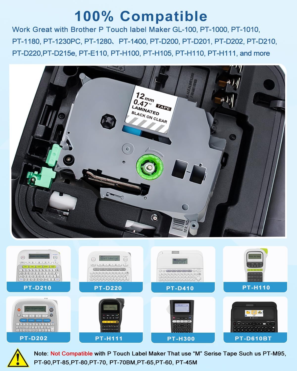 • Label Maker Tape Compatible with brother 12mm .47 laminated clear tz tape water resistant, abrasion resistant, temperature resistant, fade resistant; Replace for Brother clear label tape can be use for outdoors, and they work equally well indoors