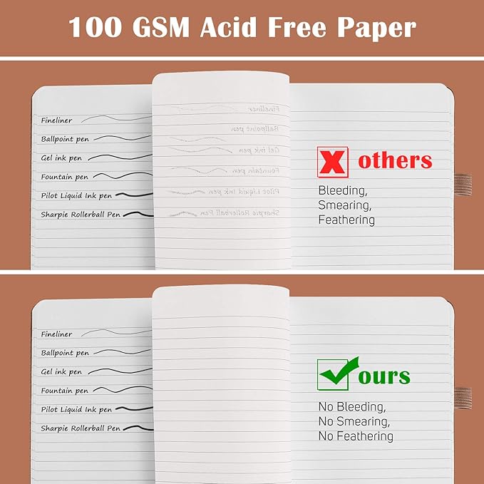 • Fountain Pen Paper: No Bleeding through for most ink pen is our paper's rigorous standard. After hundreds of test, we apply upgraded 100 GSM off-white Acid Free Paper, which helps write smoothly without ghosting, smearing and avoid eyes tiredness.