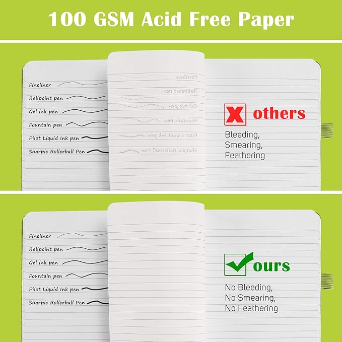 • Fountain Pen Paper: No Bleeding through for most ink pen is our paper's rigorous standard. After hundreds of test, we apply upgraded 100 GSM off-white Acid Free Paper, which helps write smoothly without ghosting, smearing and avoid eyes tiredness.