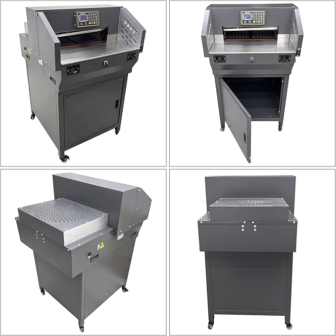 • Three Motor & Double Guide Cutting -- The paper cutter has three motors: paper pushing motor, paper pressing motor and paper cutting motor. Pushing, pressing, and cutting are all controlled by independent motors; Double-bar push paper, the paper advances smoothly, not easy to skew, and the cutting is more precise.