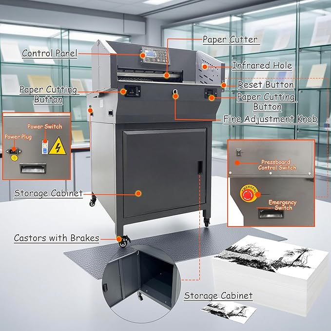 • Photoelectric Protection Design -- This paper cutter guillotine is designed with photoelectric protection. When foreign materials such as fingers enter the cutter, the machine will stop immediately, which can prevent accidents, it is very safe for the operator. Note: The paper can be pushed out by turning the paper pusher button to the right. Do not put your hand in.