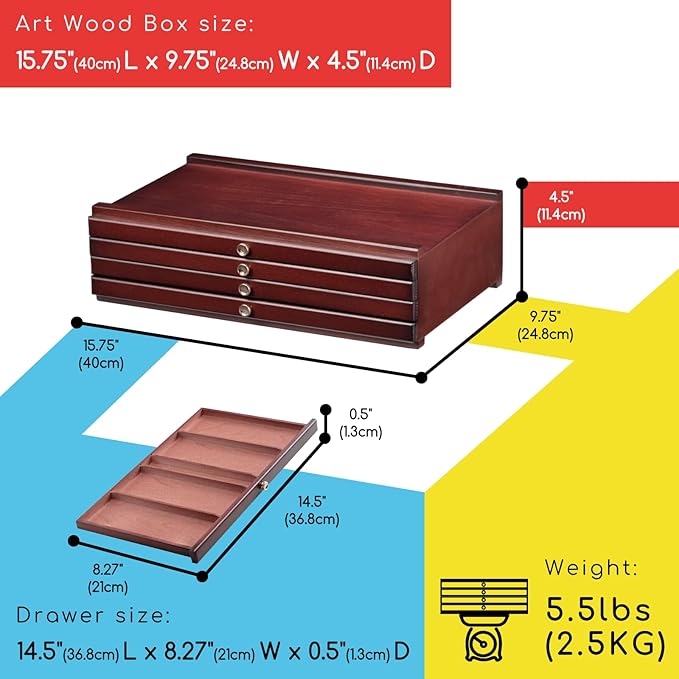 • Great Storage with Compact Box: 15.75" x 9.75" x 6.5"LWH, this wooden art box with drawers is easy to collect art supplies, simple and clear for artists and painters who want to store art tools like pastels, brushes, pens, pencils, blending tools, small accessories and more.