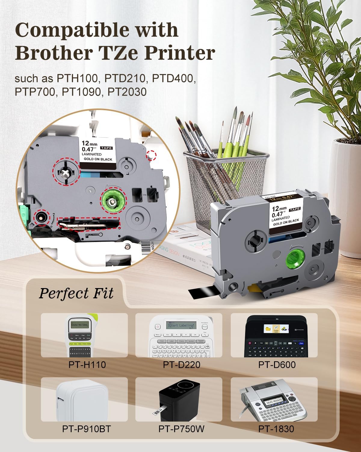 • Easy to Peel: Compatible with Brother Tz tape 12mm gold has split-back design, is easy to peel and convenient to use the 12mm Tz tape black.