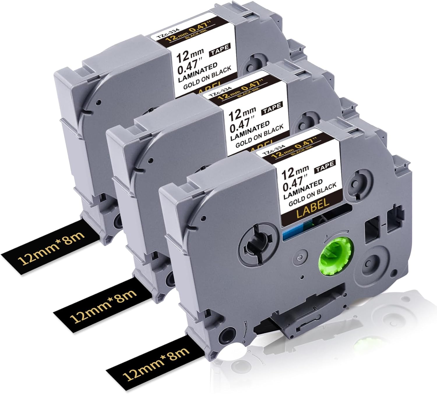 3-Pack 12mm Tz Tape Gold on Black Compatible with Brother P Touch Label Tape Tze-334 Tz Tape 12mm 0.47" Laminated Black, Work for Brother P Touch Label PT-D210 PT-H110 PT-D600 PT-D400 PT-1180