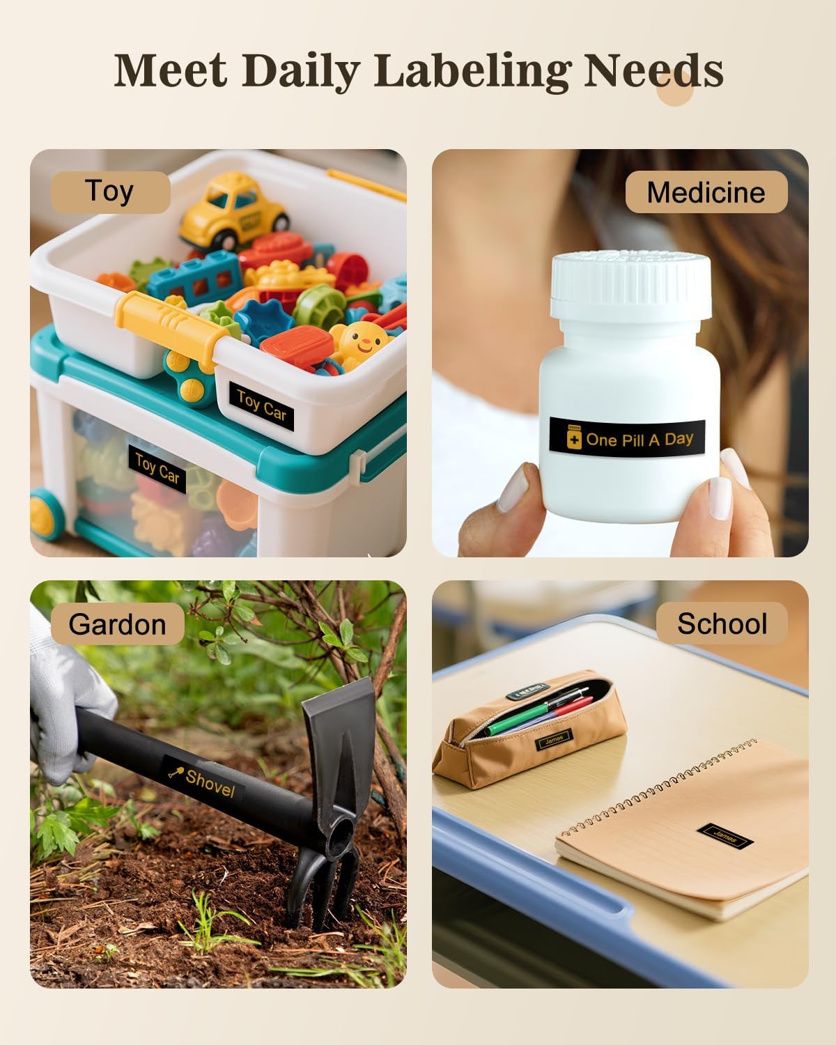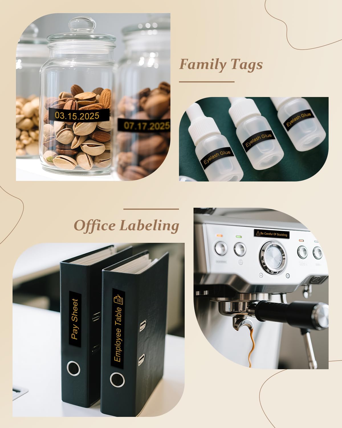 • Suitable for Outdoor and Indoor: Gold label maker tz tape has a self-adhesive backing. Widely used in offices, laboratories, kitchens, homes, warehouses, hotels, supermarkets, schools, etc.