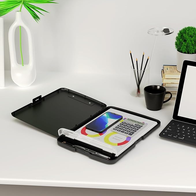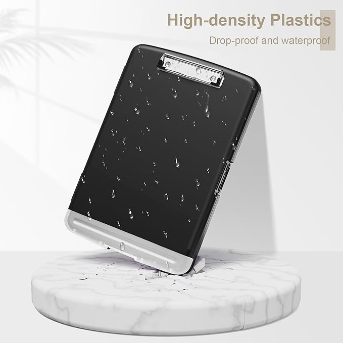 • Built to Last: Clip board with storage is made of thick plastic, high-impact, anti-fray and have a smooth surface to write on. Unique hinge-and-clasp system can withstand daily use and will not fall apart after millions of opens and closes