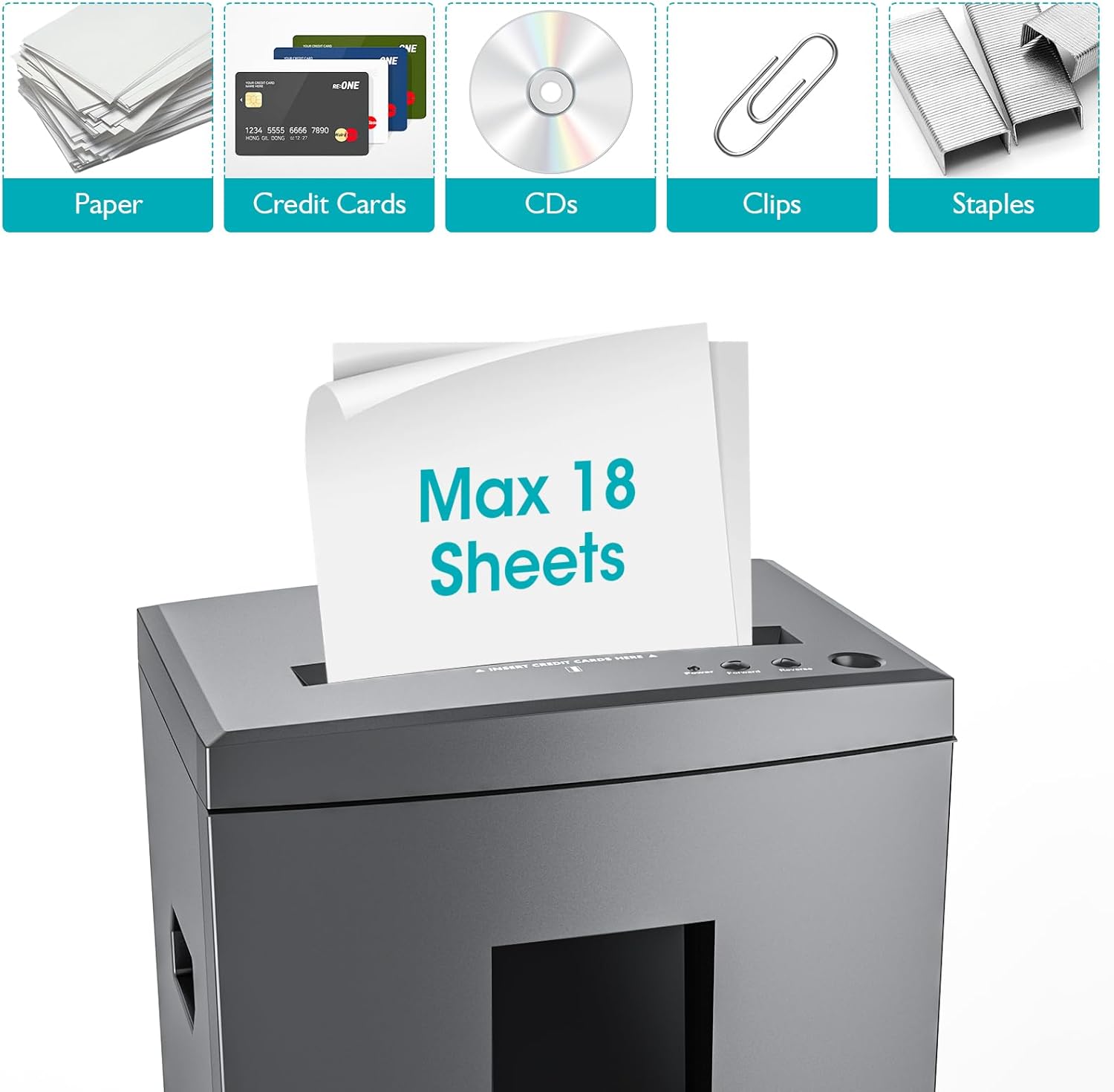 • 【Secure Cross-Cut Shredding】Cross-cut security level P-4 to secure confidential information. Shreds max 18-sheet paper/staples/clips into particles measuring 5/32" x 1-3/8" (4mm x 35mm); also shreds CD and Credit Card. The blades will cut each disc into three pieces. This crosscut paper shredder is ideal for any home office or commercial setting.
