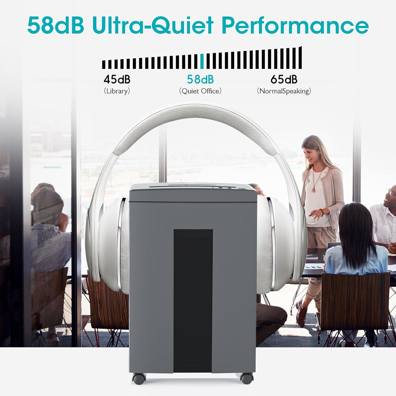 • 【Ultra-Quiet Performance】Low noise level 58dB ultra-quiet performance; 6 gallons pull-out waste bin with large easy viewing transparent window. Perfect for a home paper shredder or a quiet paper shredder for office environments.