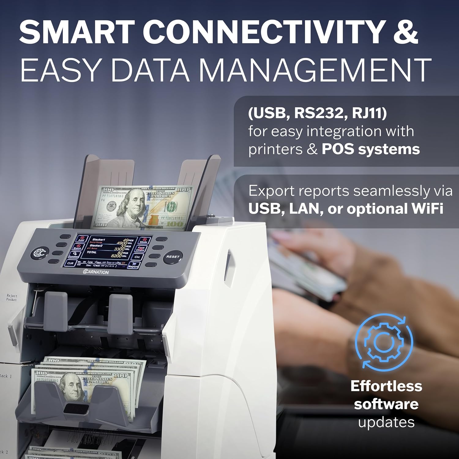 • Multi-Currency Support for Up to 128 Currencies: This money machine supports seamless counting of up to 128 currencies, including USD, CAD, BRL, and MXN, making it ideal for businesses handling various denominations.