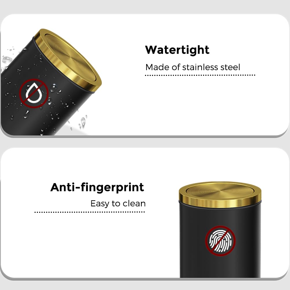 • 【 Perfect Hidden Garbage Bag 】 : This black and gold trash can features an innovative built-in pressure ring design that easily rolls up and fixes the edges of garbage bags, achieving completely hidden storage. The garbage bags are firmly locked in the bucket, saying goodbye to the embarrassment of the edges slipping or being exposed from now on, ensuring that your home space always maintains a neat, beautiful and high-end feel.