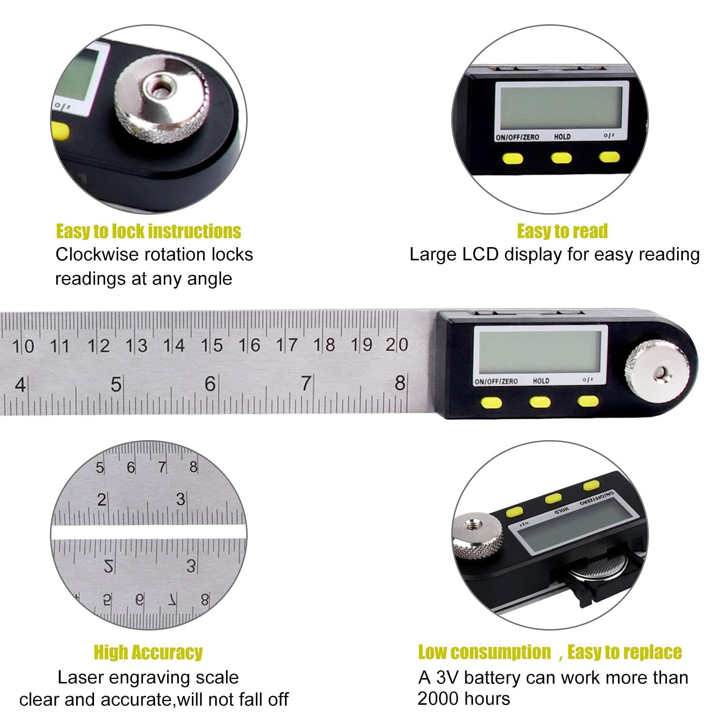 Delgada 8 inch/200mm Digital Angle Finder Ruler - Stainless Steel Protractor for Woodworking and Construction - Battery Included