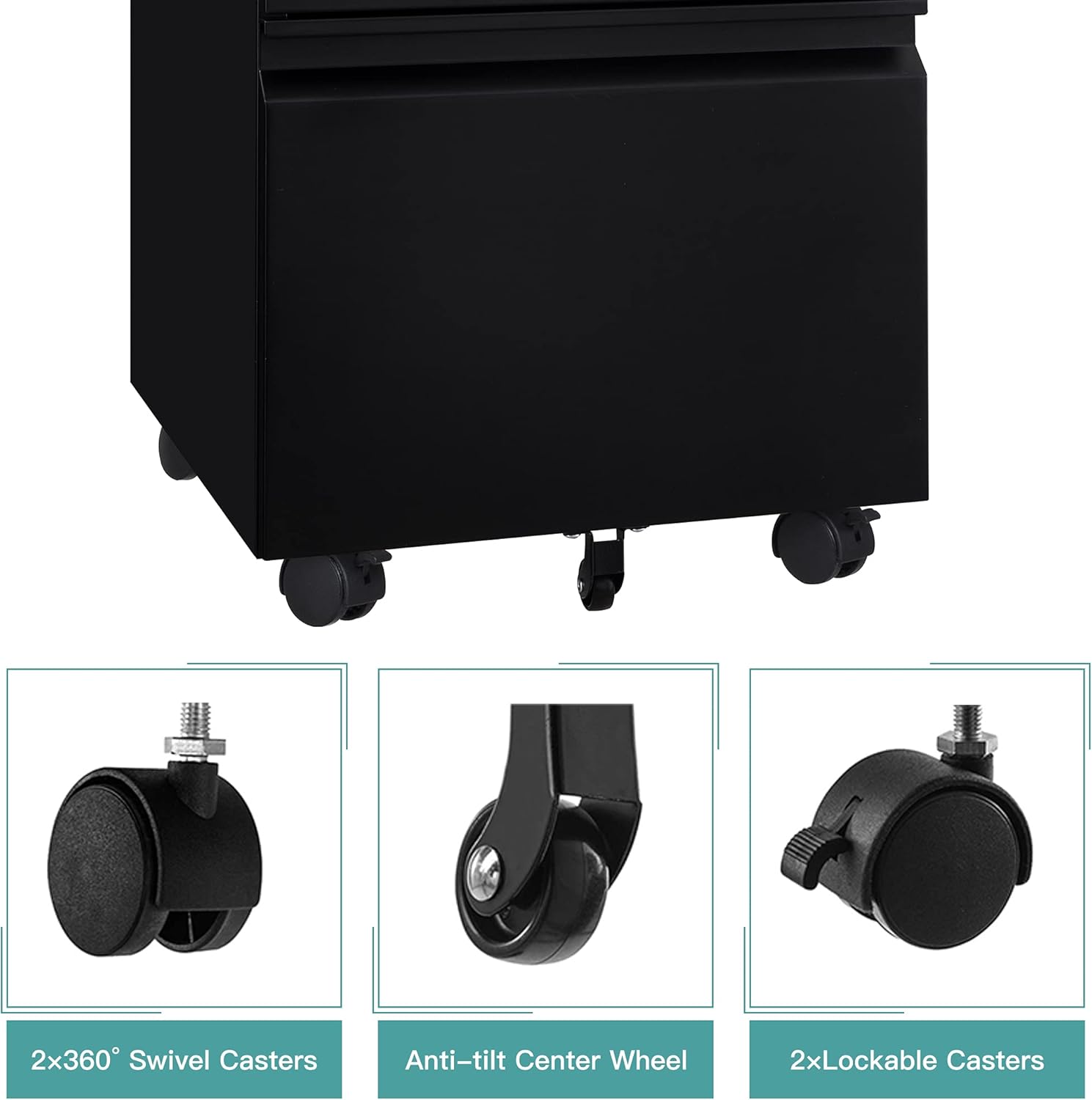 • 【Rolling File Cabinet 】: Equipped with 2 lockable casters + 2 x 360° swivel casters + 1x anti-tilt wheel, you can move it easily and safely. 360° swivel casters go to any direction easily, while lockable casters offer braking and the center support wheel prevents tipping.