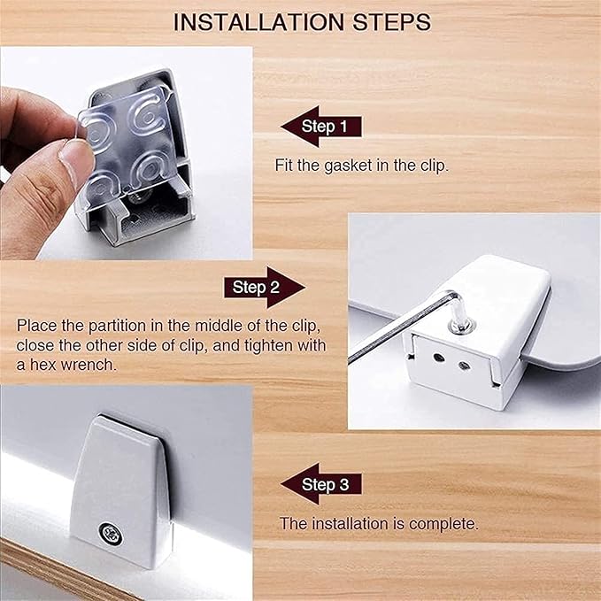 • EASY INSTALLATION: Clamp these desk dividers to your desk for a secure, yet flexible setup. 1.Peel the greenish film; 2.Install the washer in the clamp; 3.Put it on the table and tighten it with a screwdriver, or use the nail-free glue to fix the clip on the table; 4.Place the partition in the middle of the clamp, close the other side and tighten it with a wrench