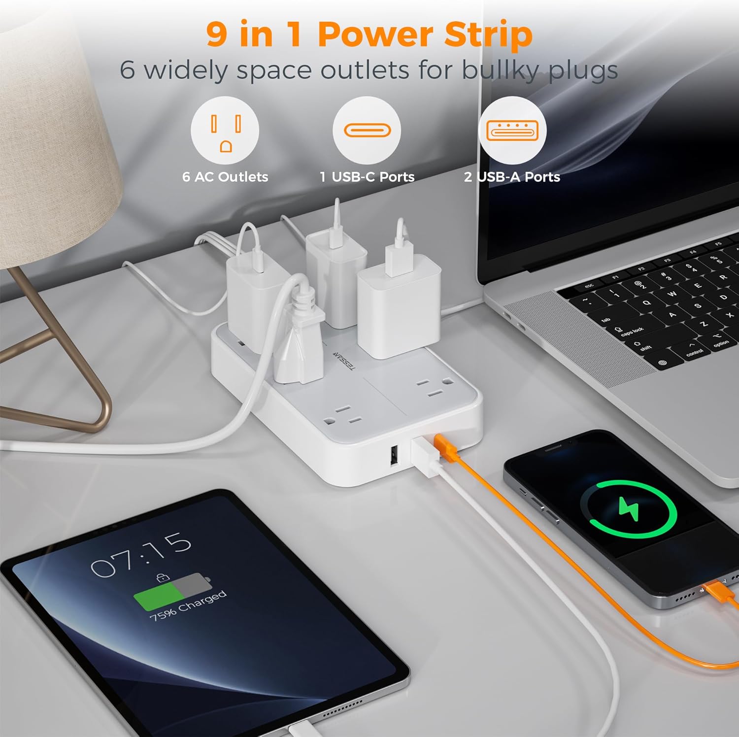 • 9 in 1 Flat Plug Power Strip: Power strip with USB ports 10 FT cord can be expanded to 6 AC Outlets, 1 USB C and 2 USB A; The USB C port is 3A (15W Max), and the USB A port is 2.4A (12W Max); 1080J surge protector power strip 10 FT cord is rated at 1250W to meet your charging needs in the dorm room, office, home, etc