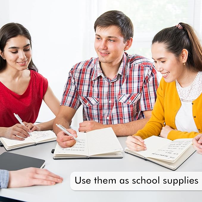 • Feela 5 Pack Classic Ruled Notebooks contains 5 classic gray ruled sturdy cover notebooks and 5 Black Retractable Pens. Each of the notebooks measures 8.3” x 5.1”, which is perfect to carry and easily held by young girls and boys. These black cute pens are customized to be placed in the pen holder, which is pretty convenient.