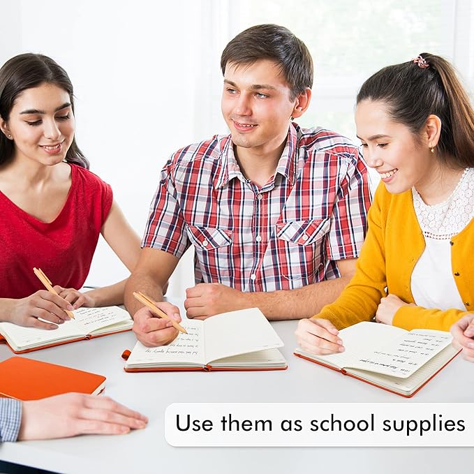 • Feela 24 Pack Classic Ruled Notebooks contains 24 classic orange ruled sturdy cover notebooks and 24 Black Retractable Pens. Each of the notebooks measures 8.3” x 5.1”, which is perfect to carry and easily held by young girls and boys. These black cute pens are customized to be placed in the pen holder, which is pretty convenient.