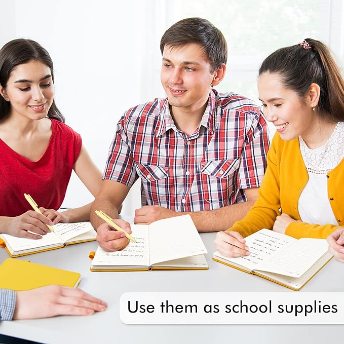 • Feela 24 Pack Classic Ruled Notebooks contains 24 classic yellow ruled sturdy cover notebooks and 24 Black Retractable Pens. Each of the notebooks measures 8.3” x 5.1”, which is perfect to carry and easily held by young girls and boys. These black cute pens are customized to be placed in the pen holder, which is pretty convenient.