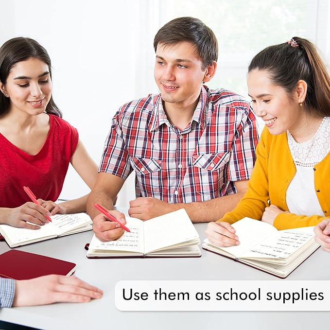 • Feela 24 Pack Classic Ruled Notebooks contains 24 classic wine ruled sturdy cover notebooks and 24 Black Retractable Pens. Each of the notebooks measures 8.3” x 5.1”, which is perfect to carry and easily held by young girls and boys. These black cute pens are customized to be placed in the pen holder, which is pretty convenient.