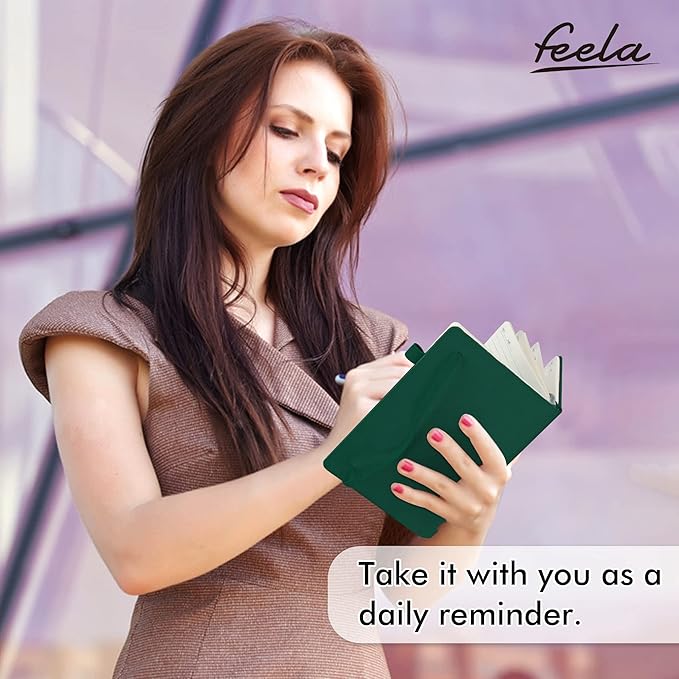 • Feela 12 Pack Classic Ruled Notebooks contains 12 classic dark green ruled sturdy cover notebooks and 12 Black Retractable Pens. Each of the notebooks measures 8.3” x 5.1”, which is perfect to carry and easily held by young girls and boys. These black cute pens are customized to be placed in the pen holder, which is pretty convenient.
