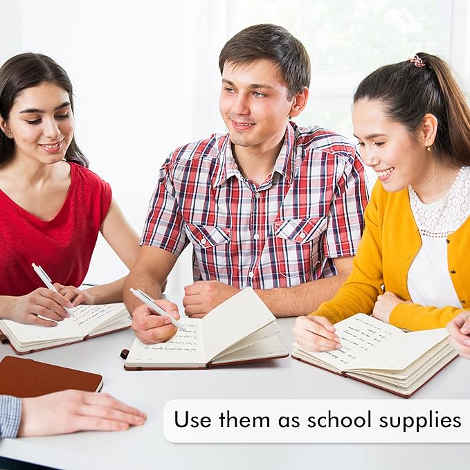 • Feela 5 Pack Classic Ruled Notebooks contains 5 classic brown ruled sturdy cover notebooks and 5 Black Retractable Pens. Each of the notebooks measures 8.3” x 5.1”, which is perfect to carry and easily held by young girls and boys. These black cute pens are customized to be placed in the pen holder, which is pretty convenient.