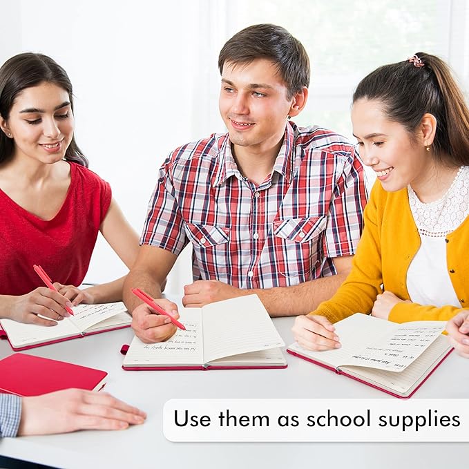 • Feela 12 Pack Classic Ruled Notebooks contains 12 classic berry ruled sturdy cover notebooks and 12 Black Retractable Pens. Each of the notebooks measures 8.3” x 5.1”, which is perfect to carry and easily held by young girls and boys. These black cute pens are customized to be placed in the pen holder, which is pretty convenient.
