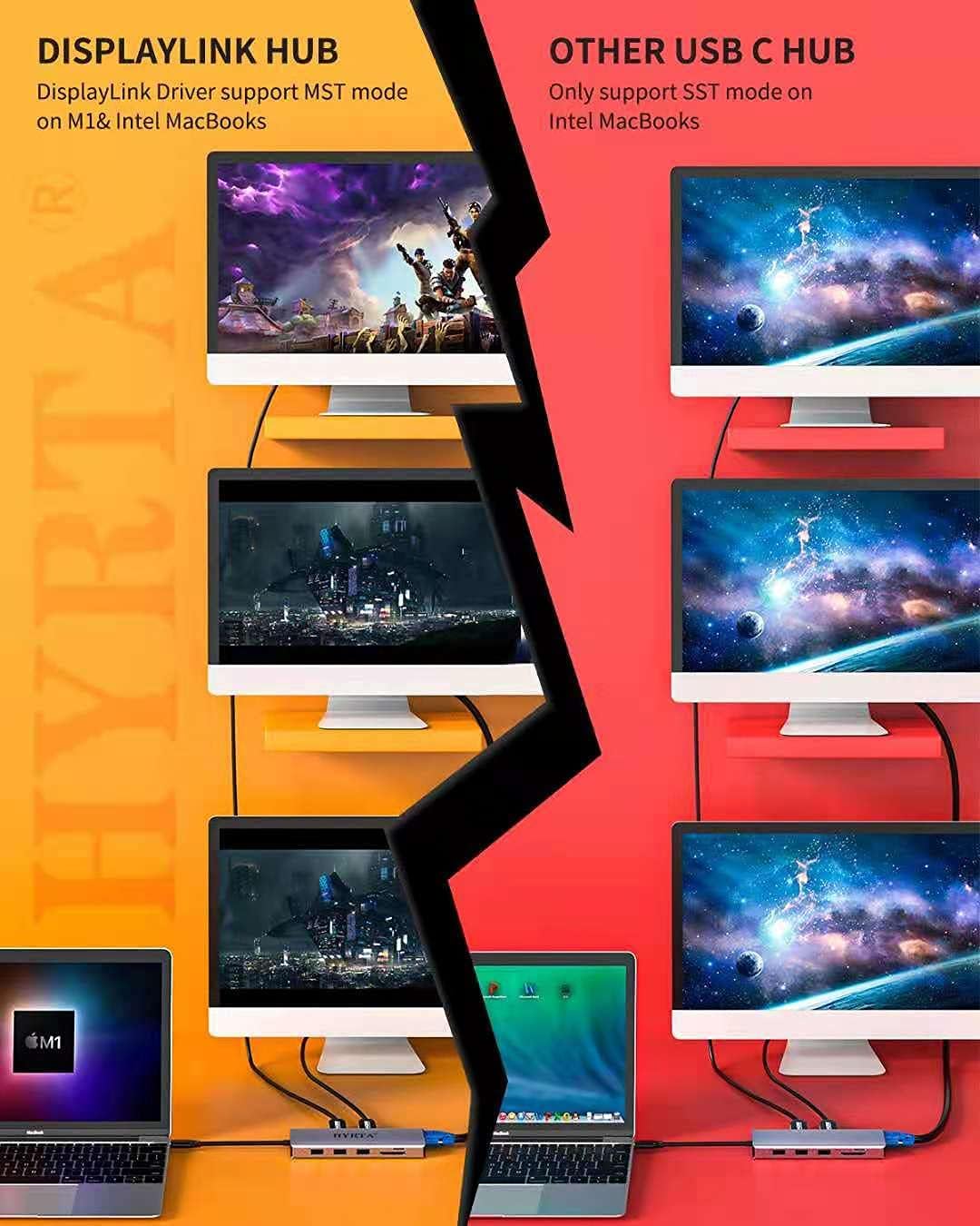 • Compatible for M1/M2/M3 MacBook :HYRTA laptop docking station has more powerful and stable with the ports of connectivity, supports triple Monitors for MacOS and Windows, and dual monitor non-mirror expended. You can expand your laptop's desktop to dual or triple displays at once to increase work and study productivity, make you start a more intelligent life.