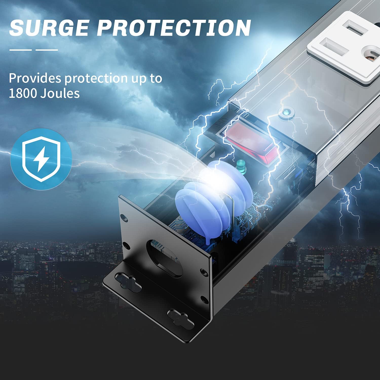 • ✅【SURGE PROTECTED POWER STRIP】This metal power strip is 1800 Joule surge protection & EMI filter & built-in 15A circuit breaker provide superior protection for everyday use in professional work areas and home offices, protecting computers, peripherals and other electronic devices from damaging surges, voltage fluctuations and noise spikes.