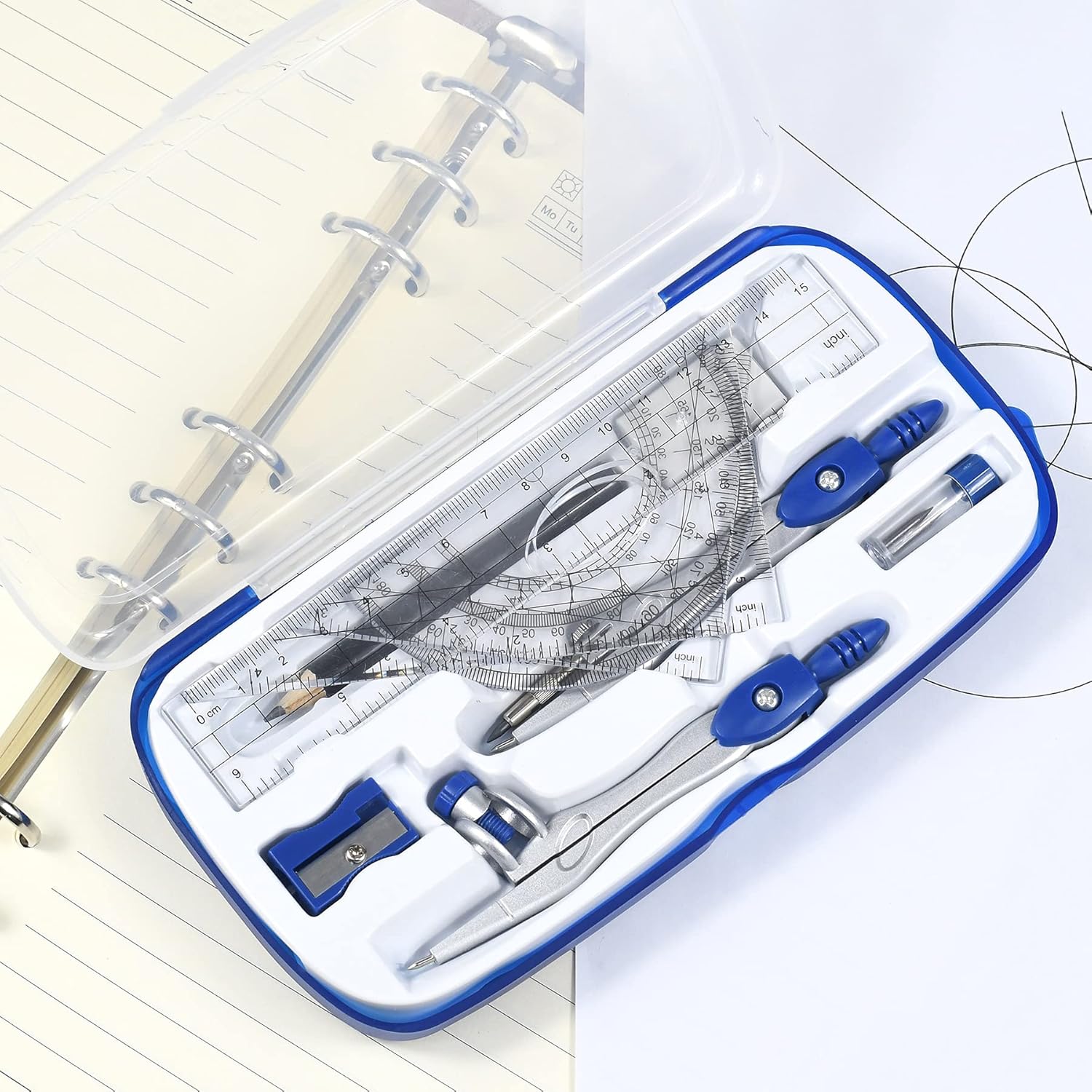 Math Geometry Kit Sets 10 Piece Student Supplies with Shatterproof Storage Box,Includes Rulers,Protractor,Compass,Eraser,Pencil Sharpener,Lead Refills,Pencil,for Drafting and Drawings(Navy blue)