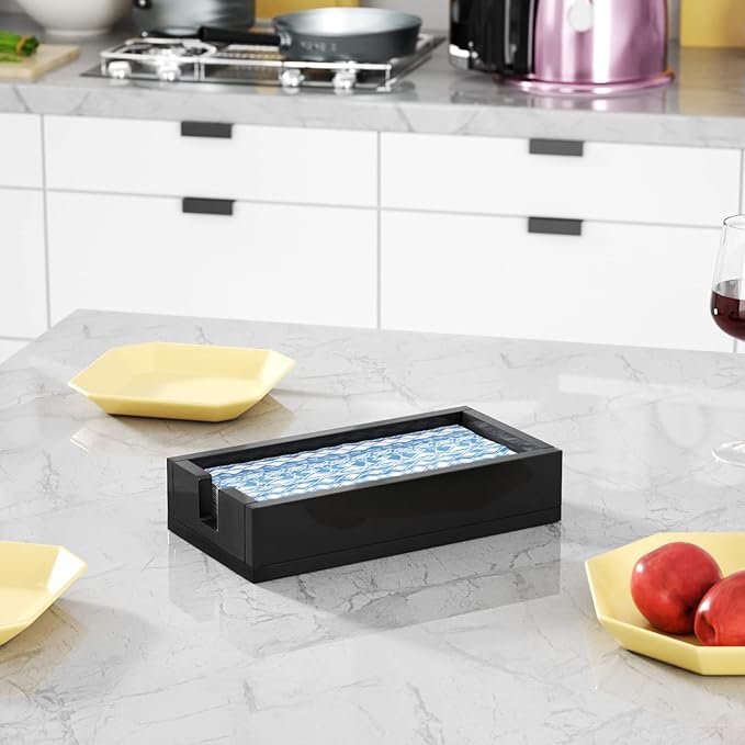 • 【Unique Design】The acrylic napkin holder features a U-shaped opening on the side, making it easy to grab a single napkin without disturbing the rest and keeping them clean and organized. We have also added four anti-slip pads to the acrylic towel holder, making it less likely to slide or fall off the table, and preventing scratches on the table surface.