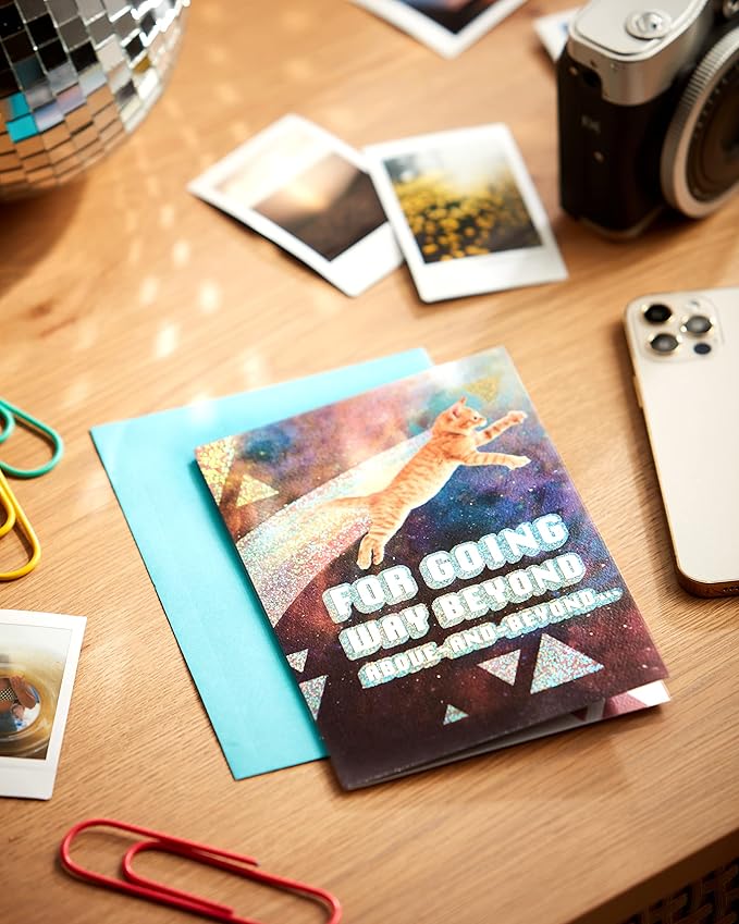 • American Greeting thank you card features an extraterrestrial design of a space cat with glitter, foil embellishments and raised detailing