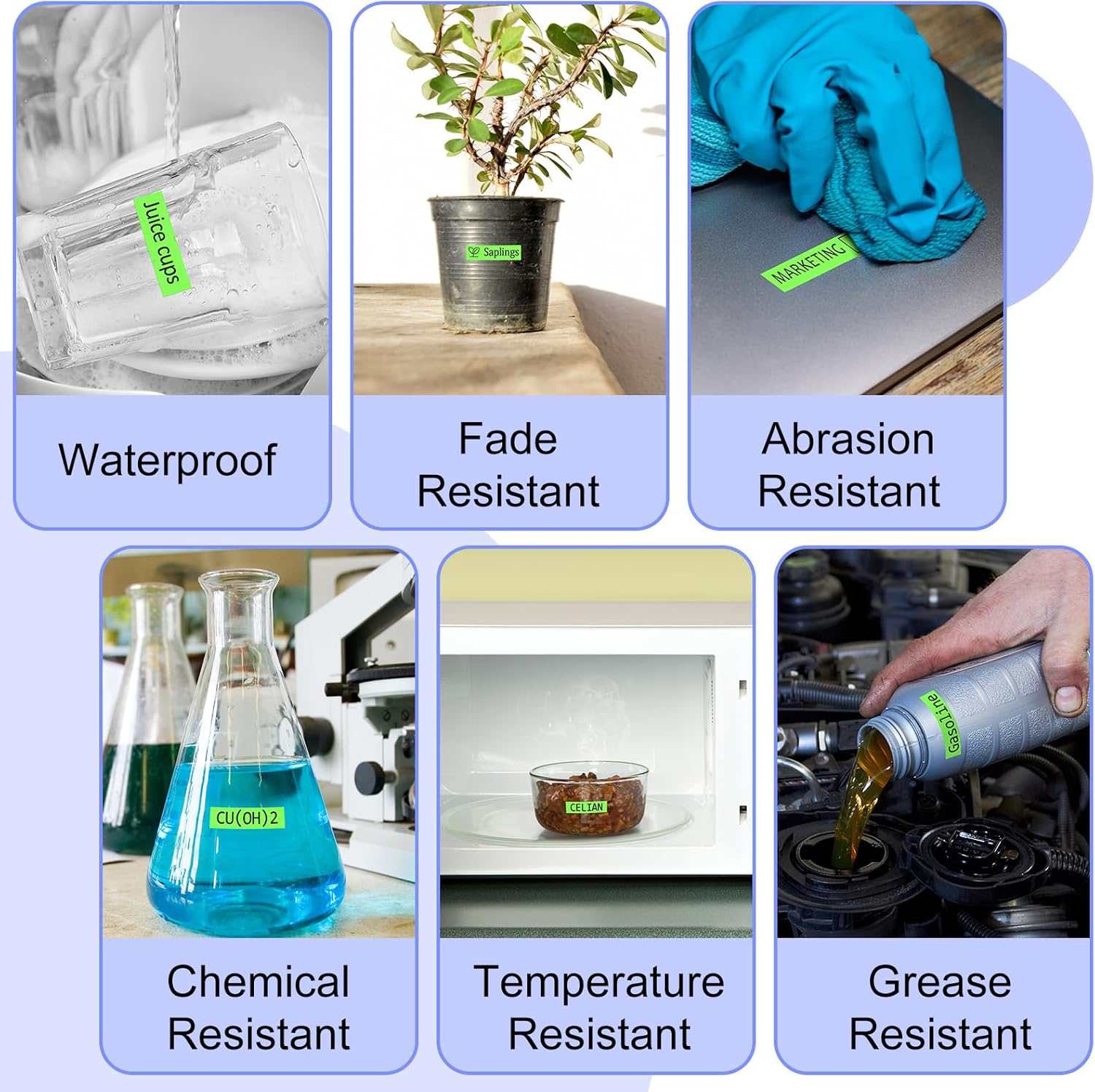 • Label features: print crisp and bold text with those durable labels making identifying and labeling things easy and hassle-free. Easy to peel with split backing and won't leave residue after removed. Water resistant, fade resistant, abrasion resistant, chemical resistant and temperature resistant.
