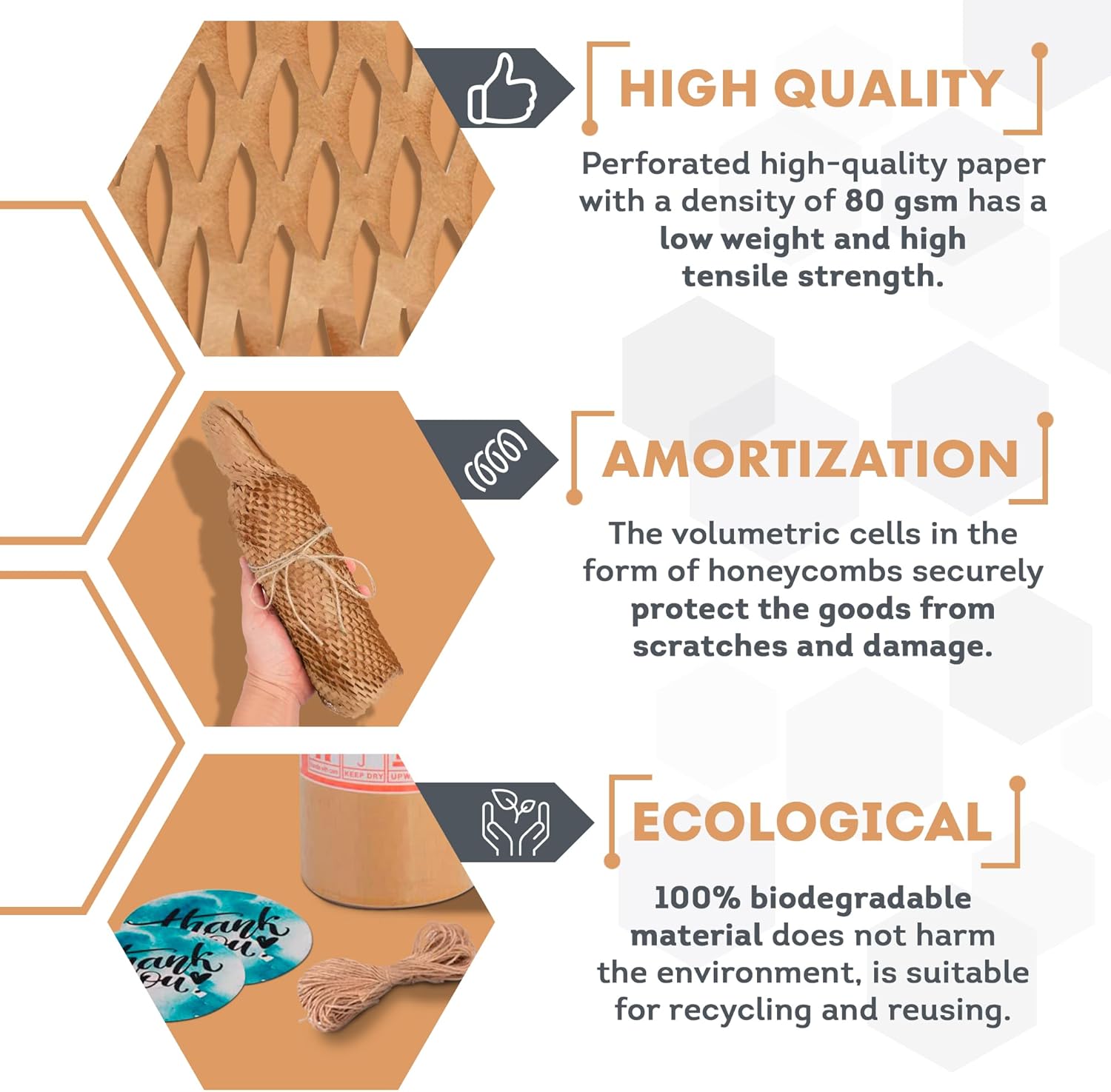 • Superior Material, Unmatched Quality. Made from thick, durable material, recyclable packing materials are not only lightweight, but also strong. The tear-resistant nature and soft texture of paper packing materials for shipping ensure that your belongings stay secure during the move.