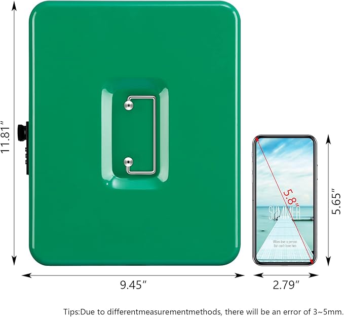 • SIZE AND COLOR: The size of the money safe box is 11.81"x 9.45"x 3.54" (300*240*90mm), and the color is Green ,bright and fashionable.