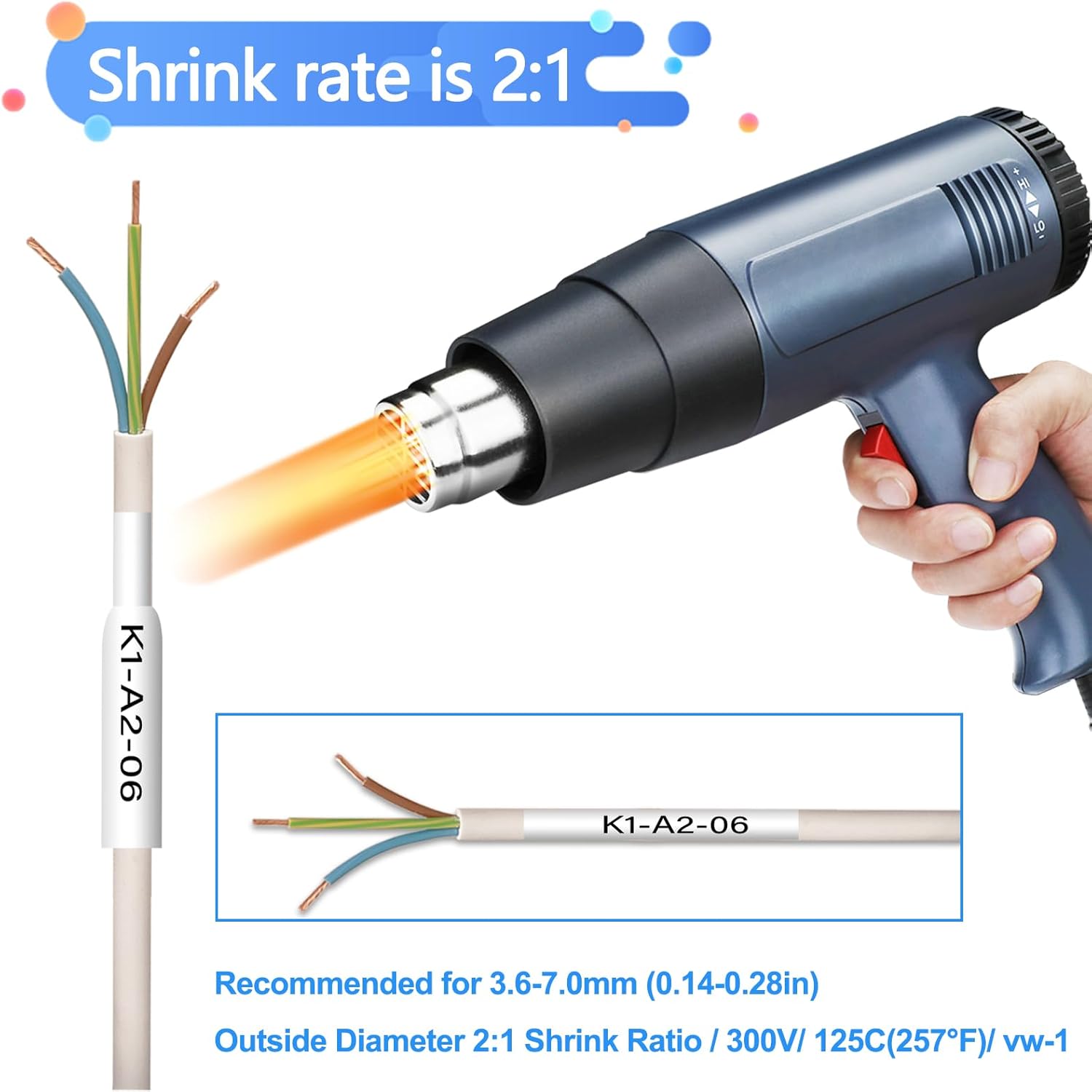 • Labeling cables more efficiently and easily: Tapes featuring shrink ratio of 2:1 which ensures a secure fit on wires and cables. You just need to slide the tube onto the wire/cable and shrink snugly to the cable with a heat gun, labels will shrink up perfectly to the wires and never curl or fall off