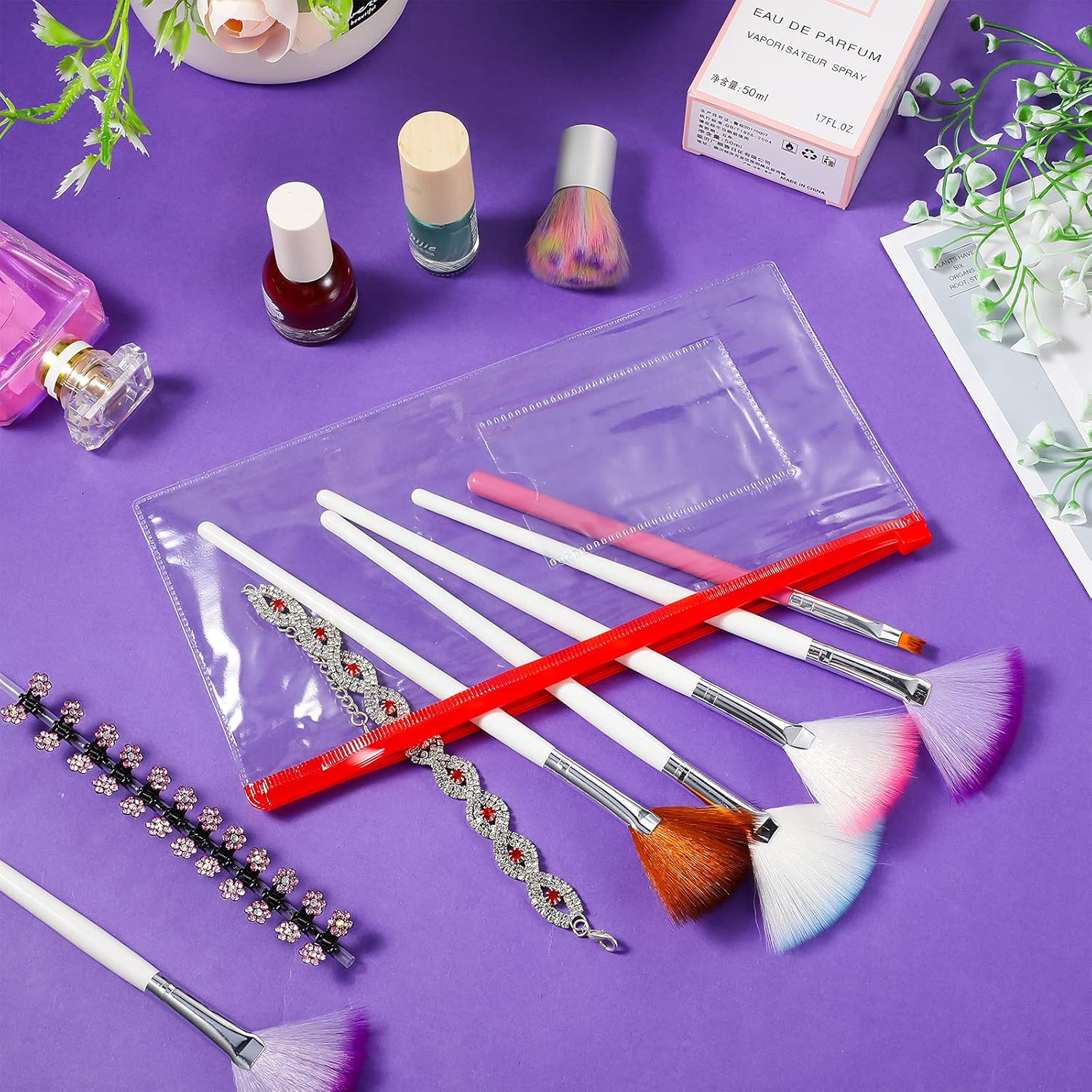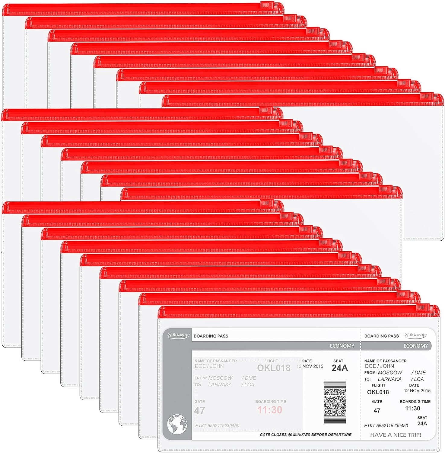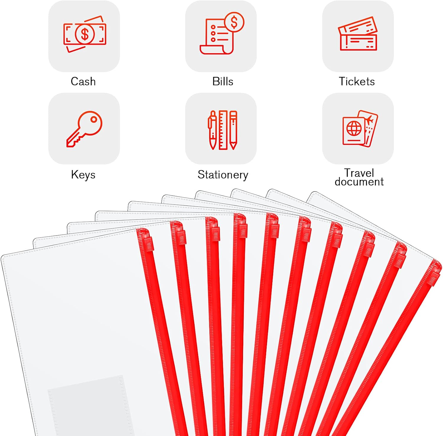 Marspark 100 Pieces Clear Pencil Case Zipper Envelope Bulk with Label Pocket Clear Plastic Envelopes with Zippered, A6 Pencil Bags for Cash, School Office Supplies, 9.2 x 4.7 Inches(Red)