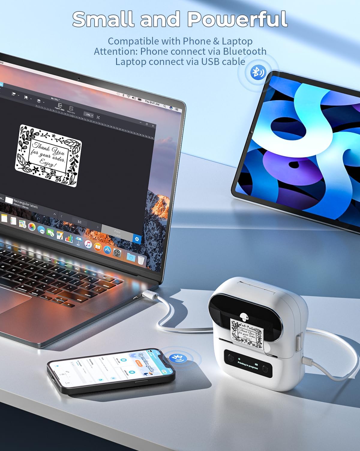 • Bluetooth Wireless Connectivity - Experience the freedom of wireless printing with the Phomemo Bluetooth-enabled label maker. Easily connect via Bluetooth on the App "Print Master" with your phone, tablet for seamless label creation on-the-go. NOTE: The Phomemo M220 label maker only supports connection via Bluetooth with phones and tablets on the App; laptop connection should be via USB