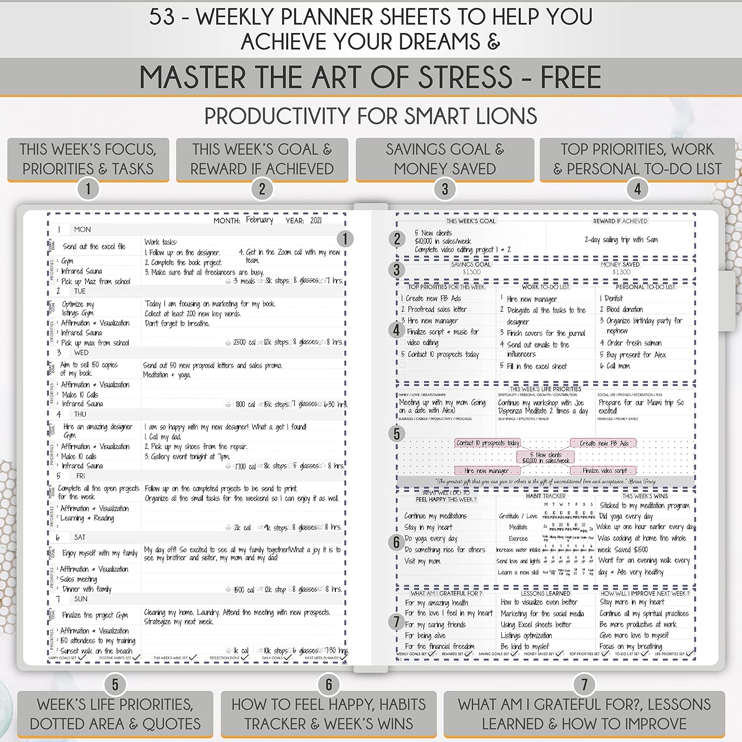 • SELF CARE PLANNER - This premium planner is undated and combines daily, weekly, and monthly planning features along with productivity, goal setting, business organization, to-do lists, notebook functionality, and gratitude journaling all in one. It includes goal-setting guidance that teaches you how to apply the law of attraction and vibration principles to become the best possible version of yourself on a mental, physical, and interpersonal level, thereby increasing productivity and happiness.