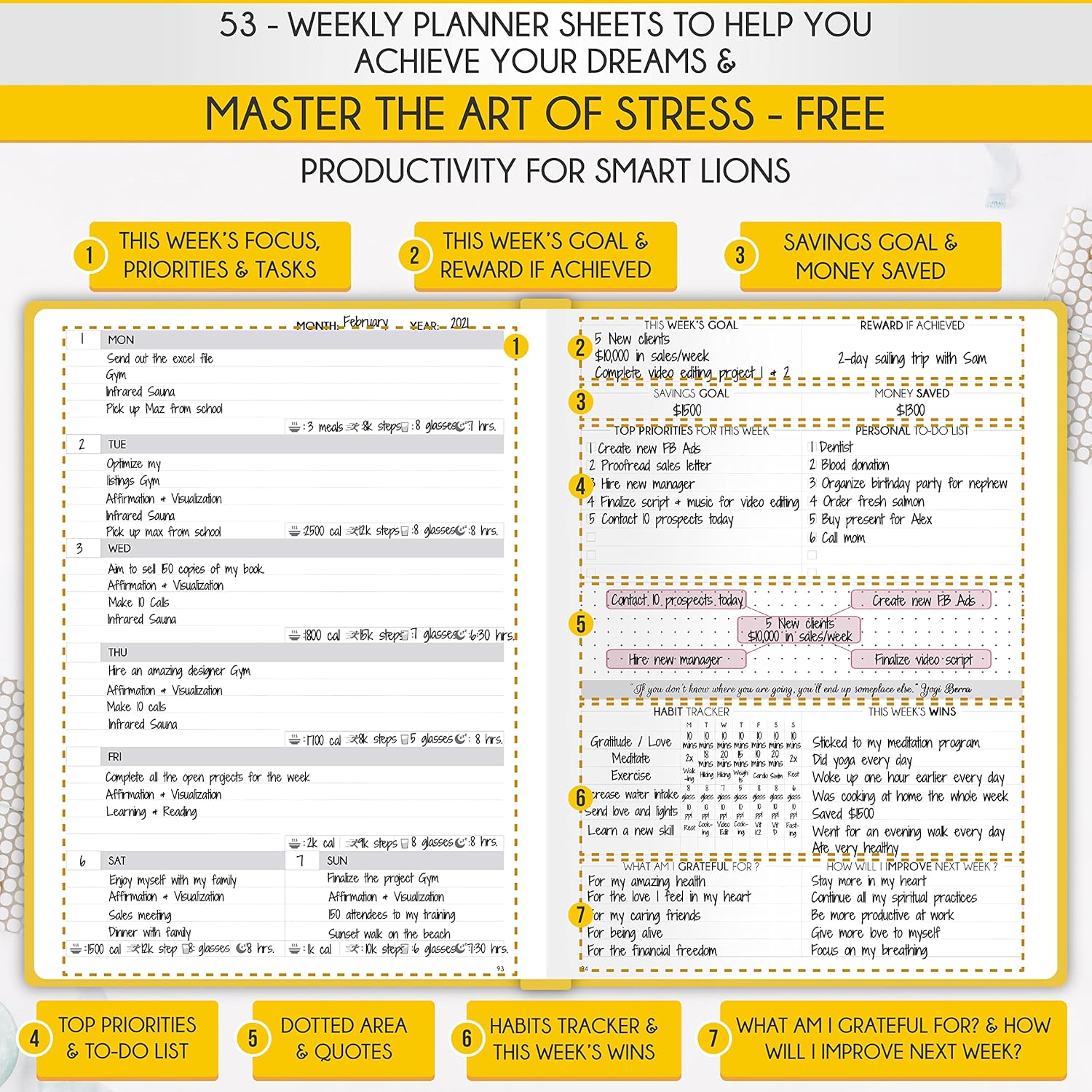 • UNDATED PLANNER - All the tools for success you need to create the life you've always wanted. This planner measures A5 (6 x 8.5 inches) and boasts thick 100 gsm paper. It features a Horizontal Planner layout, offering 212 pages for life transformation, including 53 weekly spreads, 12 monthly planning overviews with reflection sections, 22 dotted journal pages, habit trackers, mind maps, morning and evening routines, inner pockets, pen holder, and comes in a gift box. This life planner is undated, serving as a daily, weekly, and monthly planner, giving you the freedom to start your journey whenever it suits you best.