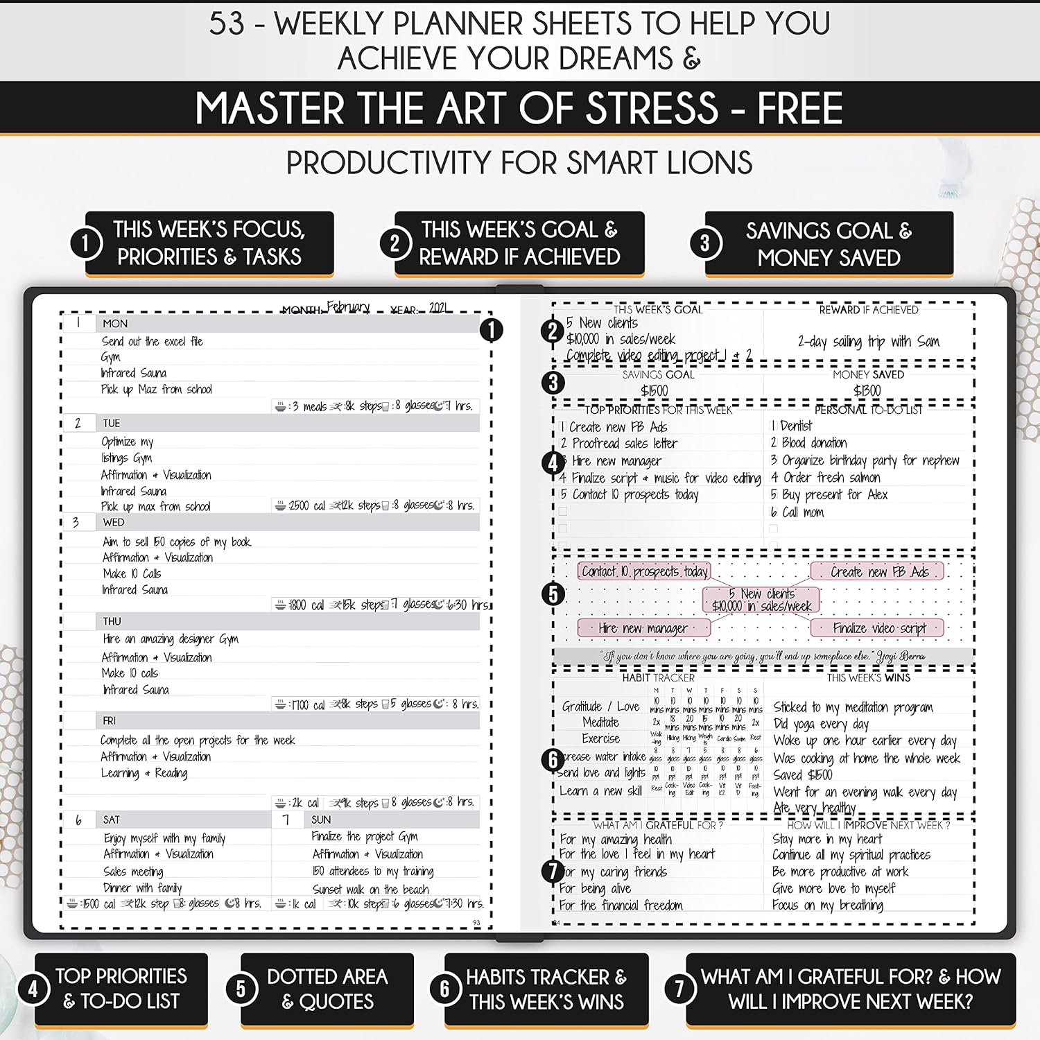 • LIFE PLANNER - A5 Size, 212 pages of life transformation, 53 weekly, 12 monthly planning overviews & reflection, 22 dotted journal pages, habit trackers, mind maps, morning & evening routines, inner pockets, pen holder & gift box