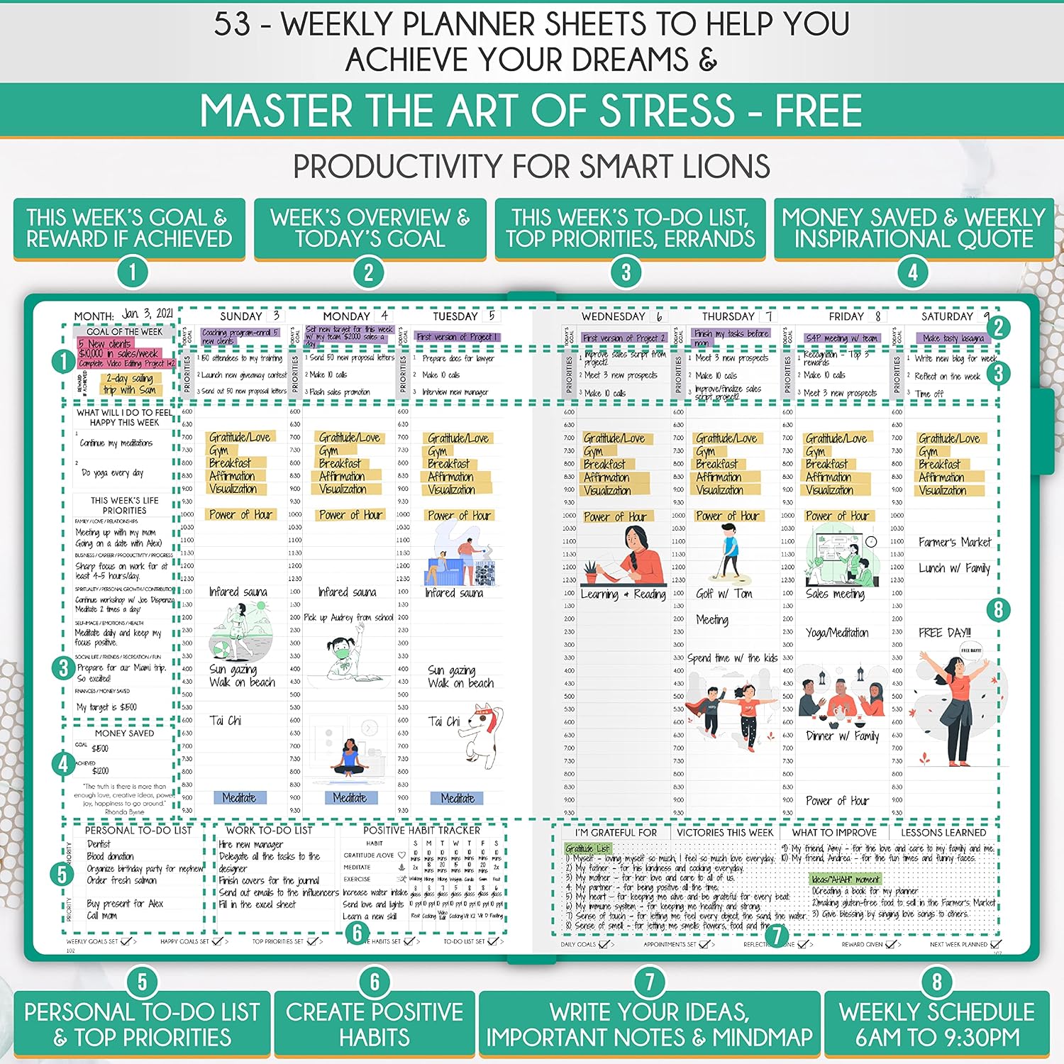• UNDATED PLANNER - All the tools for success you need to create the life you've always wanted. This large planner measures A4 Size (8.3 x 11.7 inches) and boasts thick 100 gsm paper. It features a Vertical Planner layout, offering 256 pages for life transformation, including 53 weekly spreads, 12 monthly planning overviews with reflection sections, 31 dotted journal pages, habit trackers, mind maps, morning and evening routines, inner pockets, pen holder, and comes in a gift box. This life planner is undated, serving as a daily, weekly, and monthly planner, giving you the freedom to start your journey whenever it suits you best.