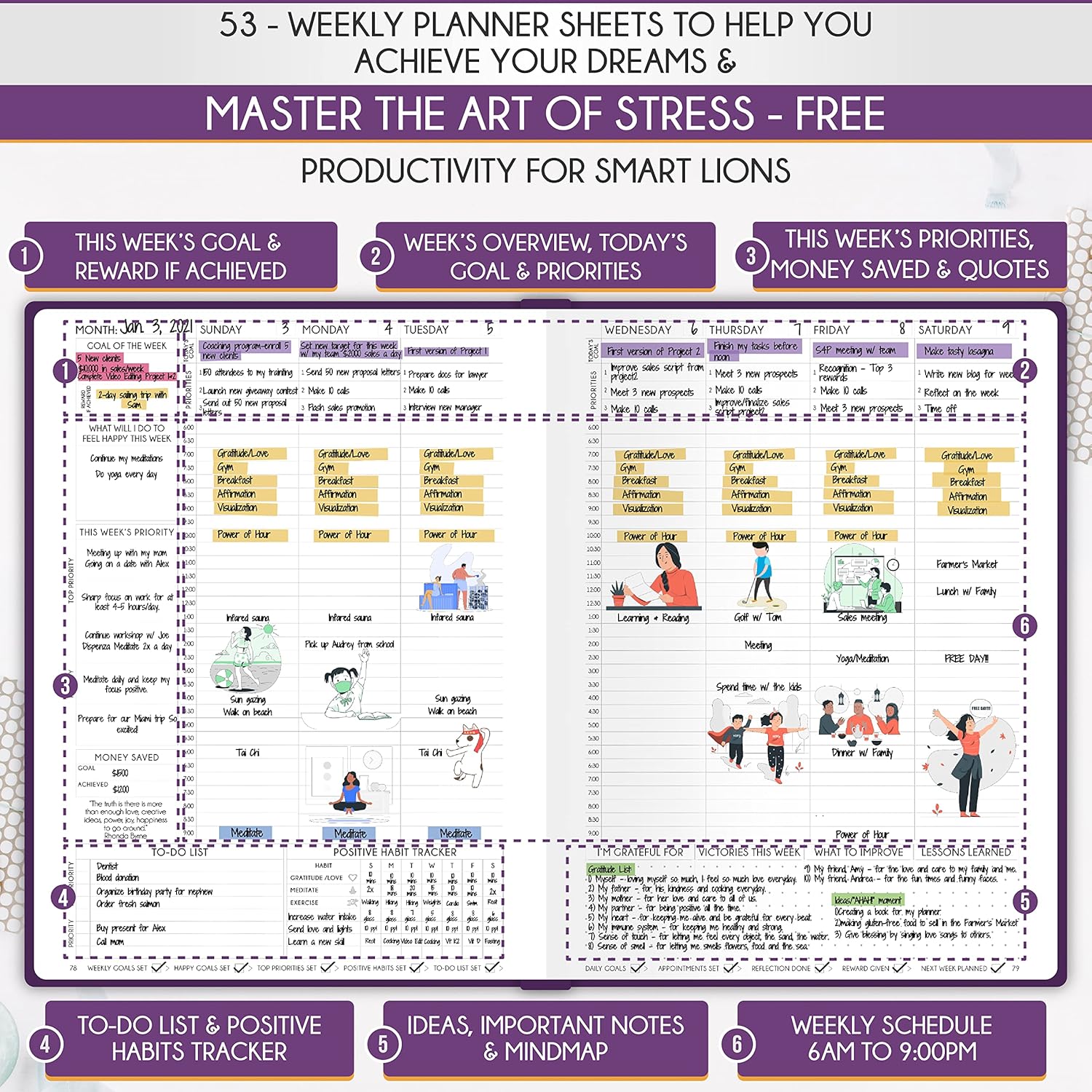 • LIFE PLANNER - A5 Size, 212 pages of life transformation, 53 weekly, 12 monthly planning overviews & reflection, 22 dotted journal pages, habit trackers, mind maps, morning & evening routines, inner pockets, pen holder & gift box