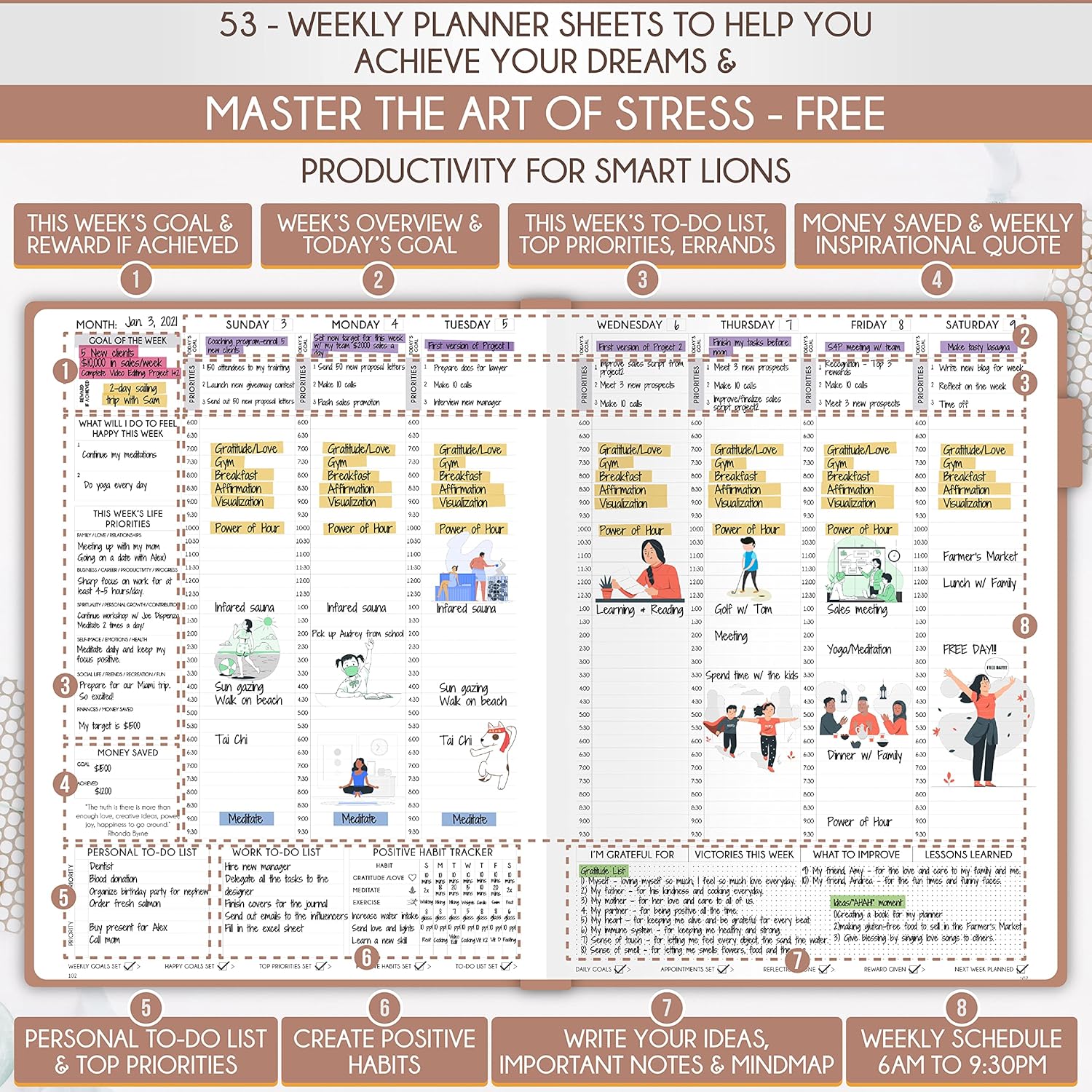 • GOAL SETTING PLANNER - Learn how to set big goals, be happy, and efficiently manage your time by adopting the same tactics used by millionaires to set and achieve them