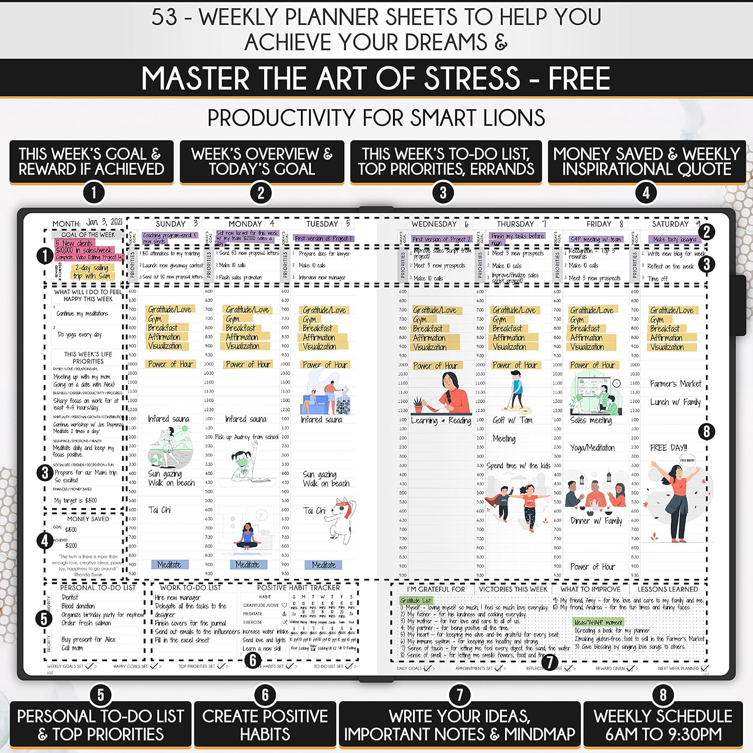 • GOAL SETTING PLANNER - Learn how to set big goals, be happy, and efficiently manage your time by adopting the same tactics used by millionaires to set and achieve them