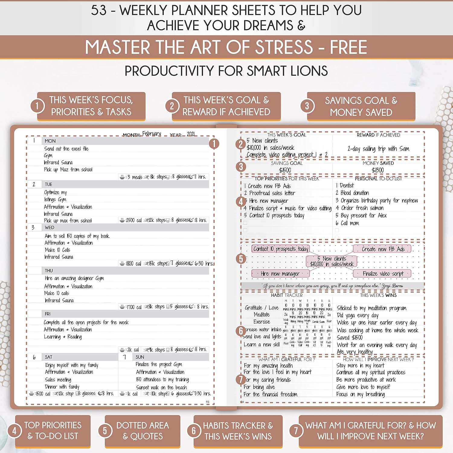 • LIFE PLANNER - A5 Size, 212 pages of life transformation, 53 weekly, 12 monthly planning overviews & reflection, 22 dotted journal pages, habit trackers, mind maps, morning & evening routines, inner pockets, pen holder & gift box