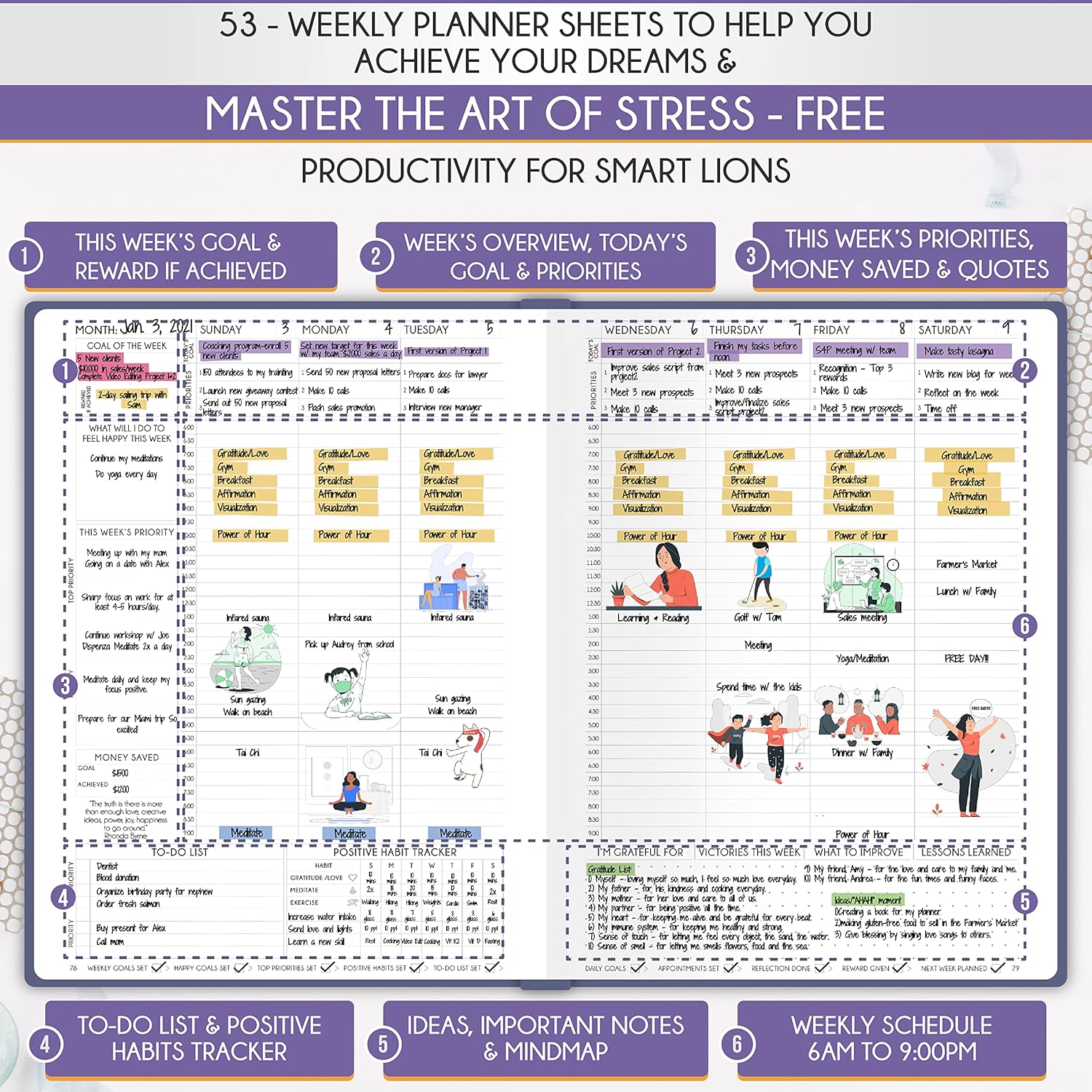 • LIFE PLANNER - Vertical Planner, A5 Size, 212 pages of life transformation, 53 weekly, 12 monthly planning overviews & reflection, 22 dotted journal pages, habit trackers, mind maps, morning & evening routines, inner pockets, pen holder & gift box