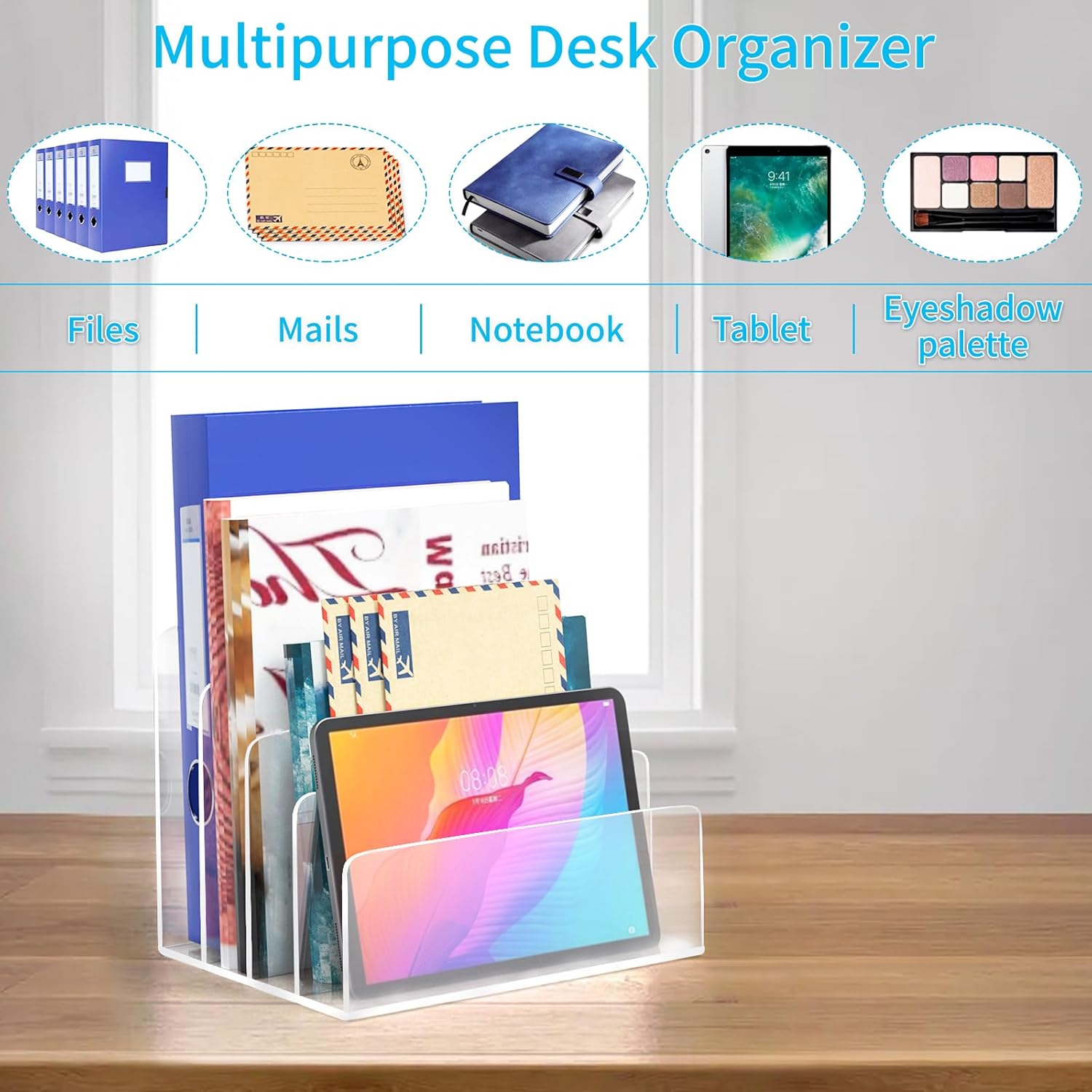 Clear Acrylic File Organizer, 4 Sections Acrylic File Holder Sorter, Office Desk Organizer for File Folder Mail Letter Book Electronics Makeup Eye Shadow Palette
