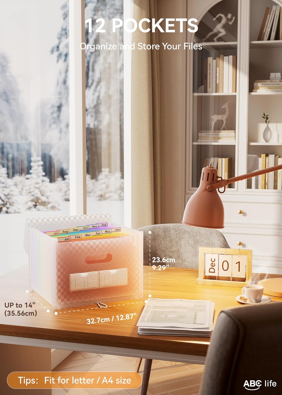 • ✅【12 POCKETS MONTHLY FILE ORGANIZER】ABC life 12 pockets Accordian File Organizer suitable for filing tax and storing important family documents. Product size is 13 "x 9.4"x 14", which can be used to store plenty of Letter/A4 size files.